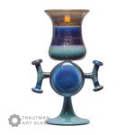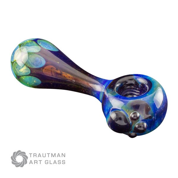Europa Star is a flame striker that will deepen its effects in the anneal cycle at 1050° F. Again, the usual precautions for an aventurine should be taken -- avoid long hot garaging and high temperature kiln strikes. However, the Stardust technology provides a very stable sparkle and we have imploded these colors in smaller marbles with success.